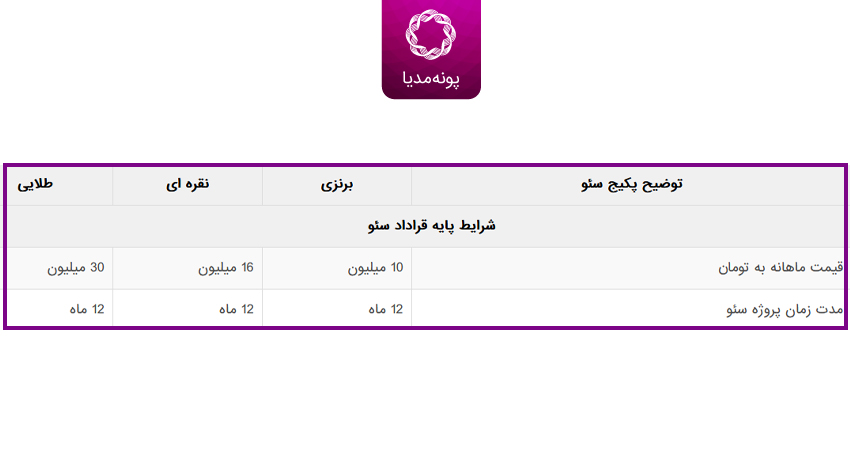 منبع ما در اعلام قیمت سئو شرکت پونه مدیاست. این شرکت خدمات سئو را در قالب پکیج هایی به مشتریان ارائه می کند. تصویر زیر لیست قیمت سئو را در سال 1401 نشان می دهد.