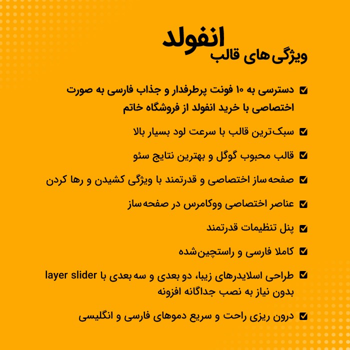 صفحهساز فوق حرفهای، قدرتمند و در عین حال ساده انفولد به صورت اختصاصی برای این قالب چند منظوره طراحی شده تا بتوانید به راحتی و در مدت زمان کوتاهی، سایت مورد نظرتان را بسازید.