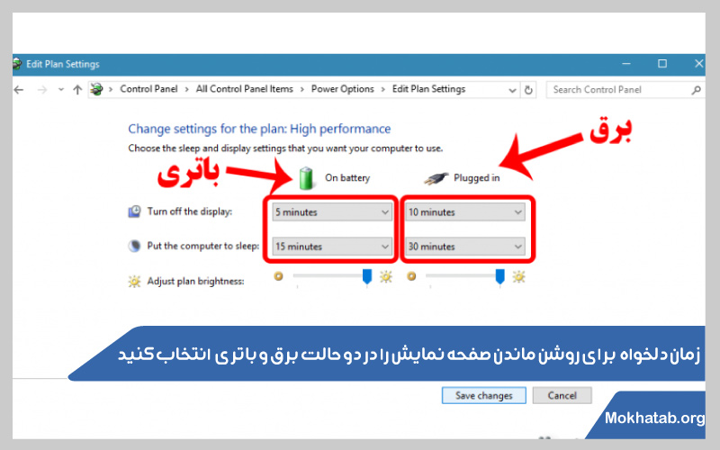 صفحه ی پیش روی شما در سیستم های مختلف کاملا متفاوت می باشد. یعنی در کامپیوتر های شخصی و لپ تاپ با دو صفحه متفات مواجه خواهید شد. برای جلوگیری از خاموش نشدن صفحه لپ تاپ پس از کلیک کردن روی گزینه Change plan settings صفحه زیر باز خواهد شد که در آن 4 فیلد برای شما مشخص شده که هریک شامل موارد خاصی هستند.