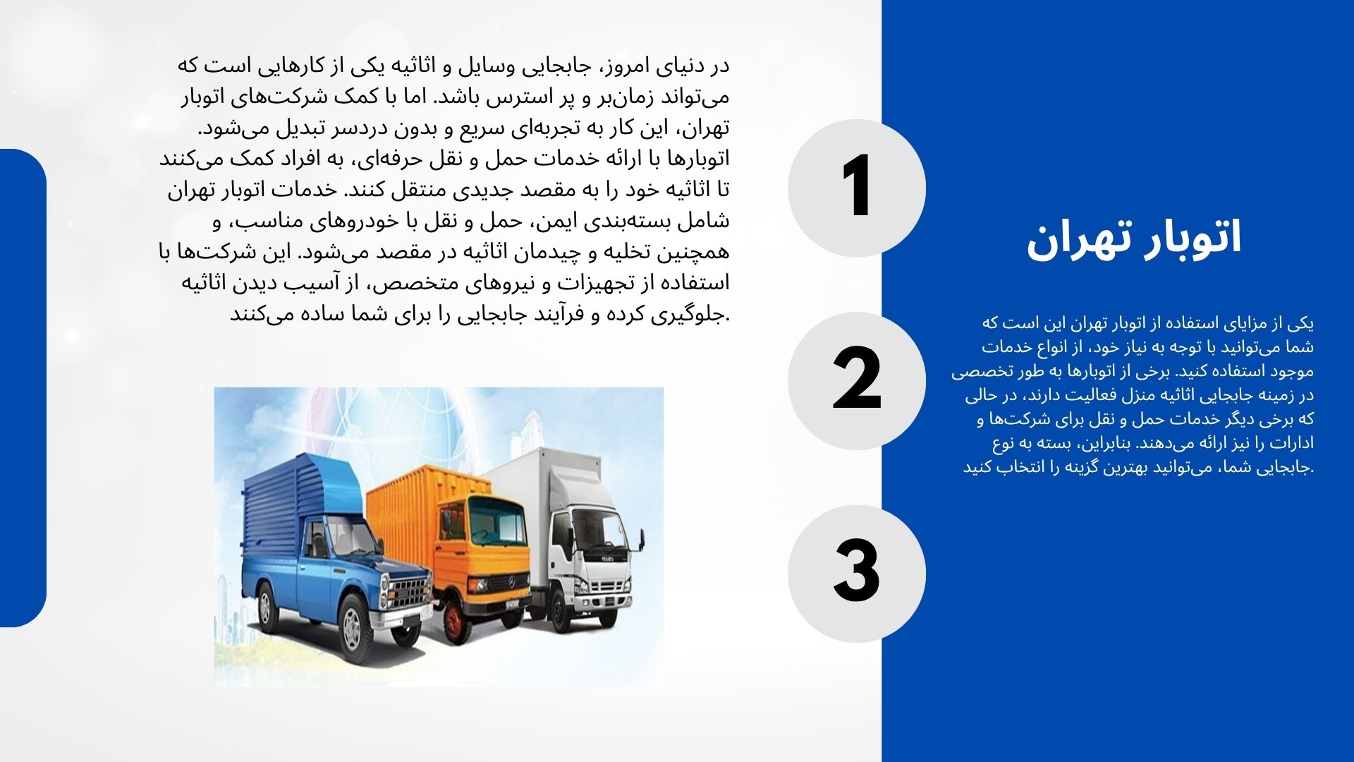 انتخاب یک اتوبار مطمئن در تهران یکی از مهمترین مراحل برای جابهجایی بدون استرس است. با توجه به حجم بالای ترافیک و پیچیدگیهای نقل مکان در پایتخت، استفاده از خدمات اتوباری که بار شما را بیمه کرده و سلامت اثاثیه را تضمین میکند، باعث اطمینان خاطر کامل میشود. این اتوبارها با بهرهگیری از تجهیزات حرفهای، بستهبندی استاندارد و تیم آموزشدیده، خطر آسیب به وسایل شما را به حداقل میرسانند و هرگونه خسارت احتمالی را از طریق بیمه پوشش میدهند.