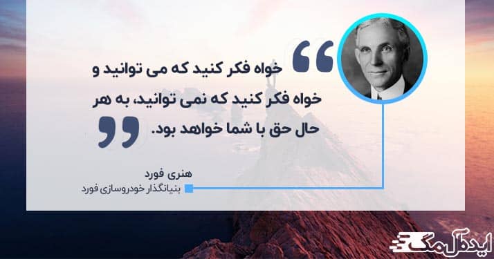 یکی از زیباترین جملات انگیزشی موفقیت، جمله هنری فورد است که میگوید: «چه فکر کنی میتوانی و چه فکر کنی که نمیتوانی کاری را انجام دهی، در هر دو صورت درست فکر کردهای و حق با توست!»