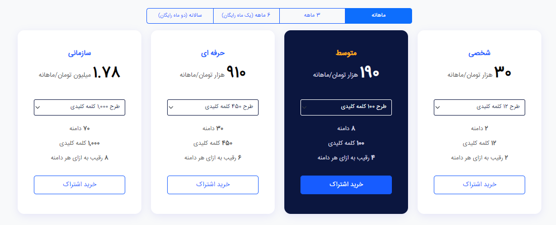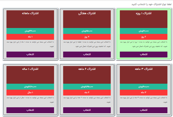 بسته های این وب سایت به چهار بازه ی زمانیه ماهانه، سه ماهانه، شش ماهه و سالانه تقسیم شده اند ارزان ترین پکیچ این ابزار 10 هزار تومن بوده و گران ترین پکیپ این ابزار دو میلیون صد هزار تومن است.